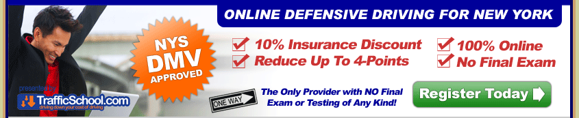 Defensive Driving OnlineIt's the complete New York Defensive Driving answer. You get a New York DMV approved program sponsored by Agency #29, a great traffic-school program, up to four (4) points reduced, and your automobile insurance discount.